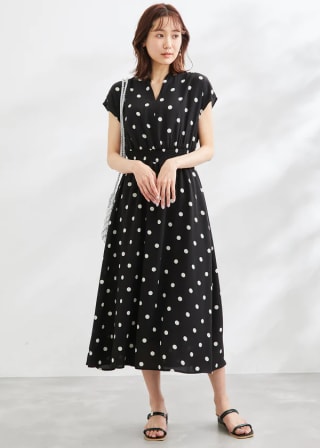 ・二の腕がほっそり見えるゆったりスリーブと、シャープなキーネックがポイントの一着。