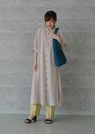 ・ふくらはぎほどの着丈で仕上げた、前開きデザインの5分袖ワンピース。