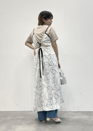 着丈は、肩紐の後ろ側を結び長さを調整して、フラットシューズで足首がしっかり隠れるぐらいです。