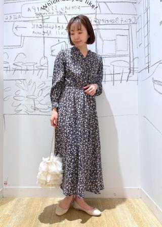 体型カバーをしつつすっきり。大人が取り入れやすい花柄ワンピース。