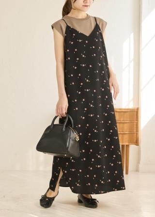 広がりすぎないシルエットで、体のラインをカバーしてくれるキャミワンピースです。プチローズ柄が可愛過ぎず大人っぽくも着ることができます。