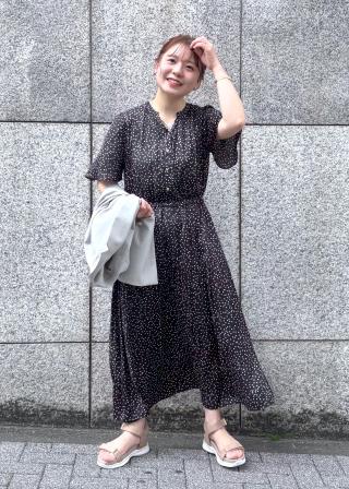 ・トップは前開きのブラウススタイル、スカートラインは広がりを抑えたティアードタイプ。