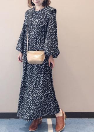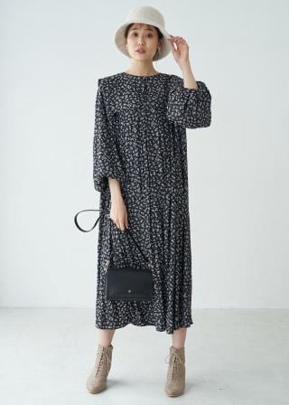 ・小花プリントのボリュームスリーブワンピース。