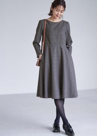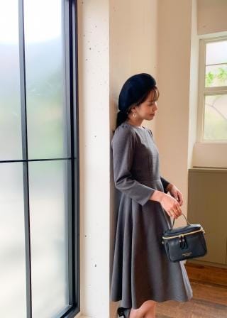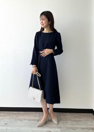 サイズ感:上半身は程よく体にフィットします。スカート部分はフレアデザインになっており、身長155㎝でふくらはぎが半分隠れるくらいの丈感です。