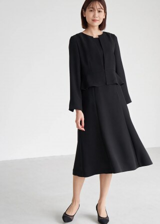 ・ペプラムシルエットのノーカラージャケットと、ワンピースのアンサンブル。