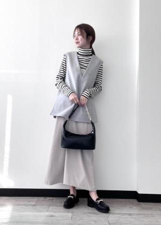 ・シンプルなリブニット合わせだとぐっと大人な印象に。