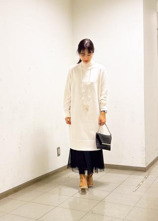 ・タートルネックのミニ丈ニットワンピース。