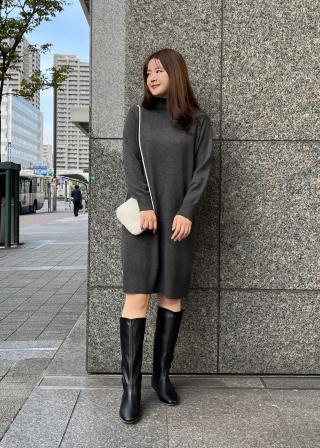 タートルネックのミニ丈ニットワンピースです。柔らかい素材なのでチクチクせず着用出来ます。