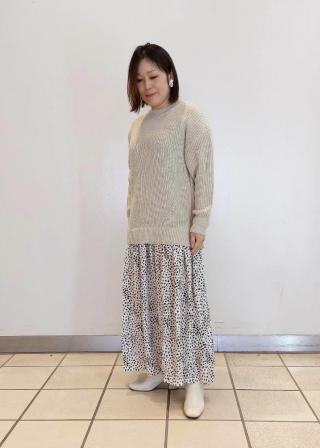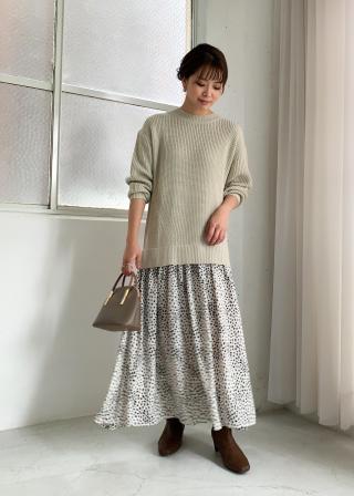 生地感・厚さ:ニットはやや厚手、スカートは薄手