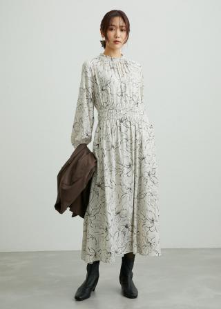 ・シャーリング使いで立体感を出したフラワープリントワンピース。