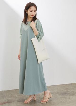 グリーンのキャミワンピースにグリーンのニット&カーディガンでワントーンコーディネートが完成。