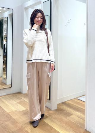 私は下半身のボリュームが気になるのと、トップスをコンパクトなもので合わせたかったので、いつもよりワンサイズ上げて着用しました。