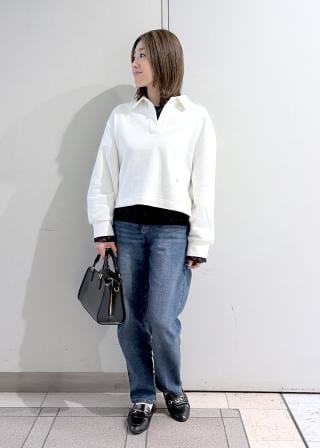 ・レイヤード風ヘンリーネックリブニット(品番:GDM16180)とのシンプルな着こなしもおすすめ。