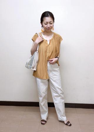 おすすめコーデ:Tシャツでカジュアルに。シアー感のあるブラウスと合わせた初秋コーデにもお勧めです。若干長めの着丈なのでヒールのある靴かソールがしっかりしたスニーカー合わせがお勧めです。