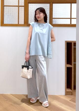 スウェットパンツですが、ピンタックのデザインでカジュアルすぎない印象。足のラインを拾わない、ほどよくゆとりのあるサイズ感です。