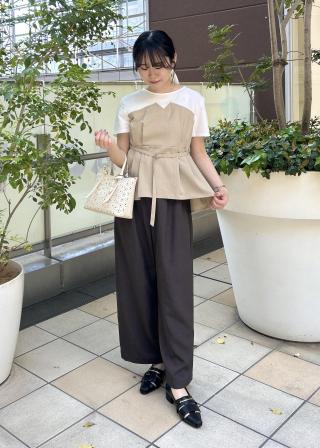 ・コンパクトなトップスをインして、メリハリのある着こなしに。