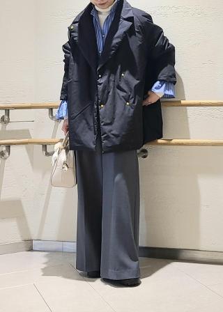 ・落ち感もある生地なので縦長効果でのスタイルアップに。