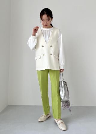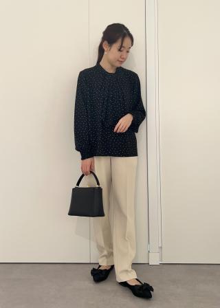 ・ボリュームのあるブラウスをインして、メリハリのあるスタイリングに。