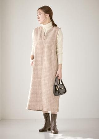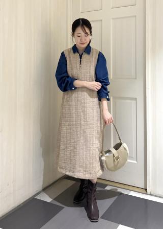 ・ロングワンピースに羽織りジャケットを重ねて、女性らしさを引き立てるモードな着こなしも◎。