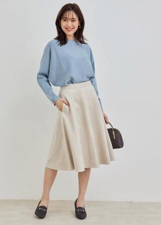 素材感:スウェード調の素材がコーデを柔らかい印象にしてくれます。ヒールはウッド調で、流行り廃りがないデザインです。