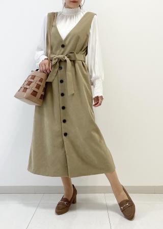 素材感:スウェード調の素材がコーデを柔らかい印象にしてくれます。ヒールはウッド調で、流行り廃りがないデザインです。
