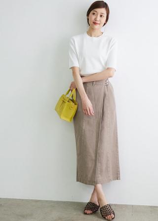 おすすめコーデ:カシュクール風のデザインなのでトップスはシンプルなものを合わせて。私の体型には少しサイズ感が大きいのでトップスはインしやすいブラウスや薄手のニットなどを合わせるとバランスよく着れます。