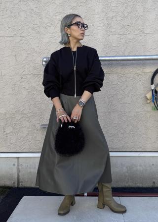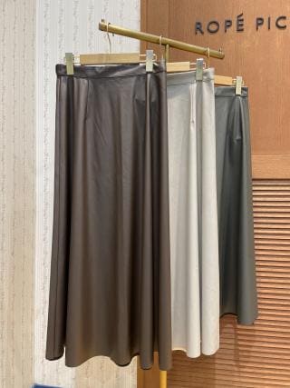・色合いがしっかりと出る、シンセティックレザーを用いたフレアスカート。