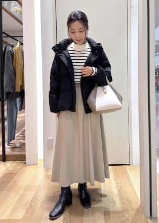柔らかい素材とフレアのシルエットなので、女性らしい印象で合わせていただけます。