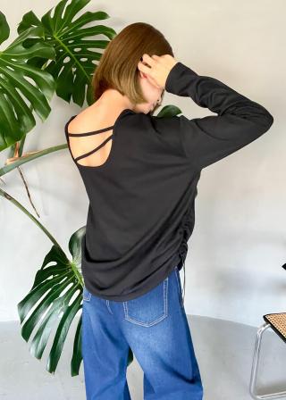 ・大きく開いたバックネックは、左右に走らせたストラップデザインがアクセント。