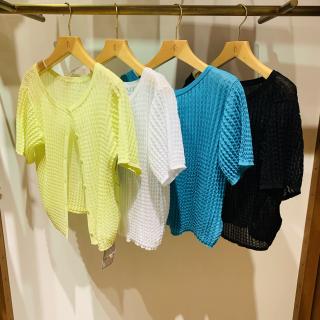 シアー感のある素材で、肘が出るハーフスリーブのカーディガンなので、夏に涼しく着用できます。ぽこぽこ素材でトレンド感があり、1枚で着映えします!
