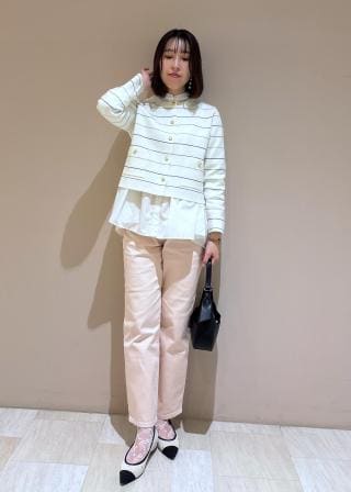 ・ピンクやオフホワイトはスウィートな印象なので、ダメージジーンズやカーゴパンツに合わせて辛口で引き締めるのも◎。