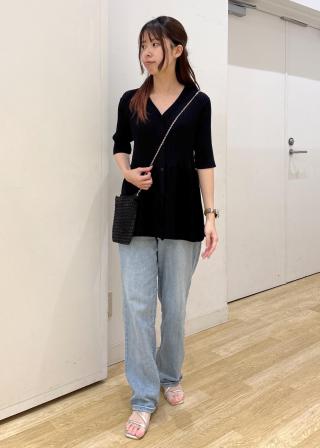 深めのVネックが大人らしく、ペプラムの甘さとのバランスが良いです。