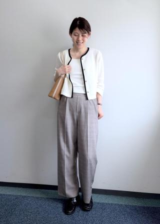 ・きれいめパンツと合わせる、オフィスにも最適な上品スタイル。