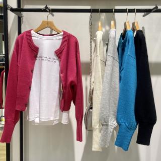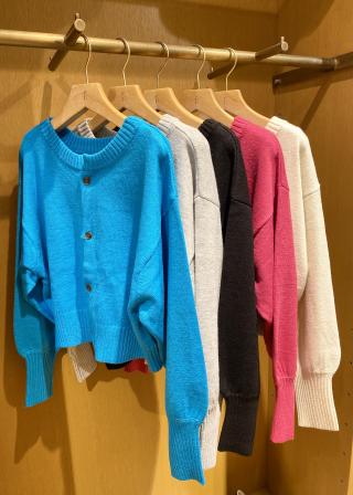 肩口が落としめのデザインなので、それに伴って身幅もゆとりがあり身体のラインを拾いません。袖丈は手の甲がすっぽり隠れる長め丈です。袖口にしっかりとリブが入っているので、軽く捲っていただいても腕周りのシルエットがたっぷりとして可愛いです。