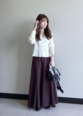 ・ふんわりと広がるシルエットのスカートと合わせたフェミニンコーデもおすすめ。
