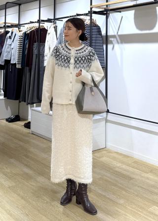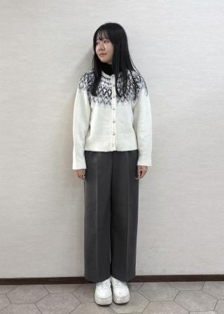 カーディガンの上半分のみの柄のためくどくなくボトムスとも合わせやすいです。