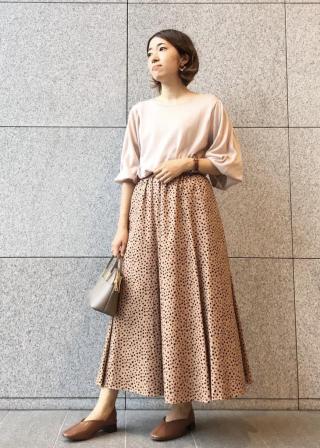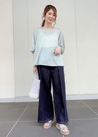 おすすめコーデ:ボリュームスリーブとシアー素材で華奢見えするトップスです。