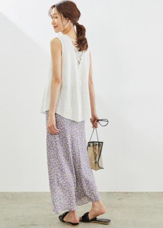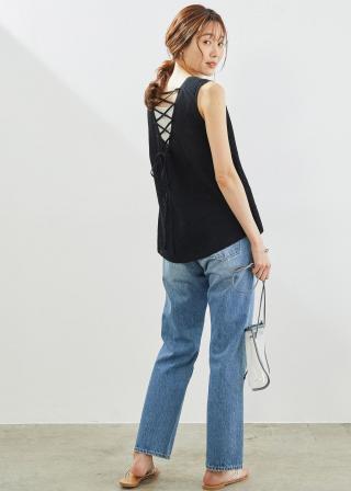 ・バックスタイルのレースアップディテールが目を惹く、ノースリーブのメッシュプルオーバー。