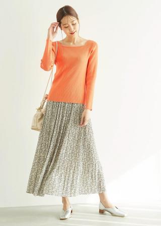 ・柄物のロングスカートを合わせてフェミニンなデイリースタイルに。