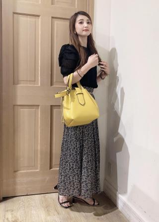 ・花柄プリントスカートに合わせて季節感のあるスタイルをマーク。