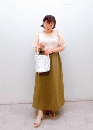 ・プリントスカートを合わせてエレガントなお出かけルックが完成。