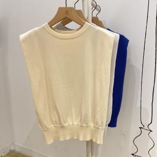 ・タックを入れて肩まわりに立体感を持たせた、スリーブレスのニットプルオーバー。