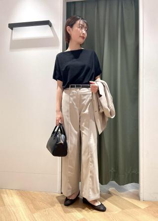 生地が薄く、軽い素材。二の腕もキレイに見せてくれますし、腕周りも動かしやすいです。着丈は、ウエスト位置なのでインしなく着用できるアイテムです。夏に嬉しい機能性が備わっているので、一枚あると便利です。