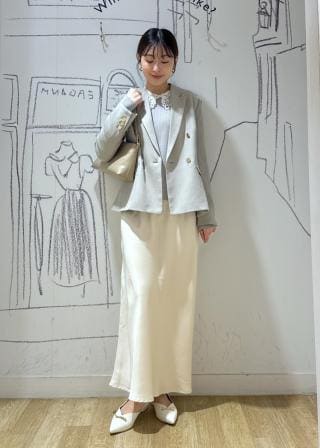 ・ジャケットのインナーとして、衿元を華やかに見せる着こなしがおすすめ。