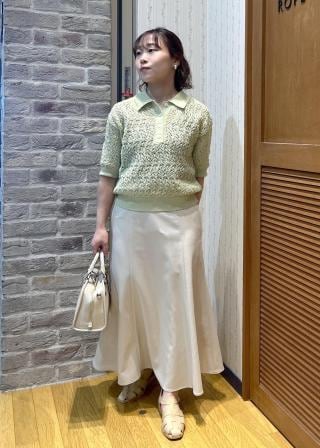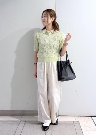 ・繊細なウェーブ状の透かし編みがさりげない表情をプラスし、顔まわりを華やかに見せるクラシカルなポロ衿が特徴。