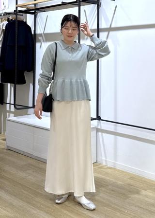さらっとした肌触りで、生地も気持ち薄手なので春のニットにぴったりの1枚です。伸縮の効く柔らかな生地で着心地も良いです。身頃は程良くフィット感のあるサイズ感で、裾はふんわりと広がるペプラムデザインなので、メリハリのある女性らしいシルエットで合わせて頂けます。