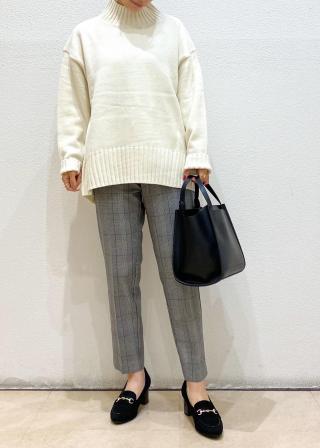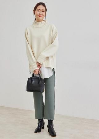 ・体を包み込むゆったりとしたシルエットがモダンなハイネックニット。