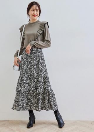 ・花柄のプリントスカートならぐっと女性らしく着こなせる。