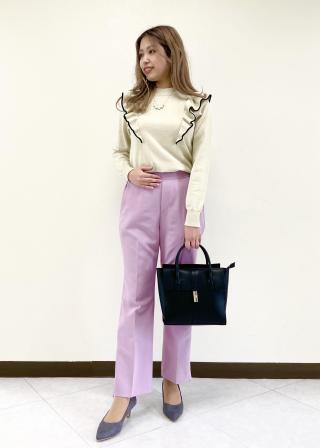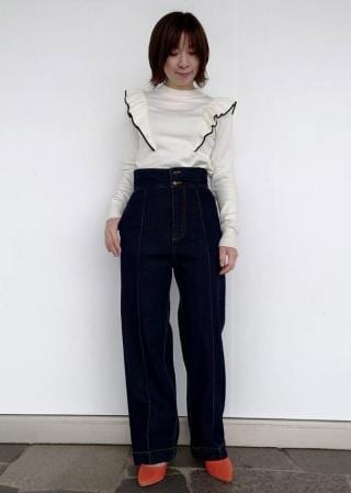 おすすめコーデ:綺麗め〜カジュアルまで幅広く着回しができます。肩フリルで少し甘めの印象なので、ボトムはシンプルなものを選んで頂くと甘すぎないコーディネートを楽しめます。