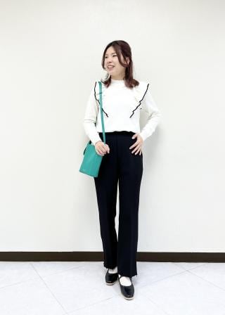 サイズ感:程よくフィット感がありつつ、タイトすぎないのでラインは拾いにくくなっています。肩フリルがあることで、縦のラインができるのでスッキリとしたシルエットに見せてくれます。